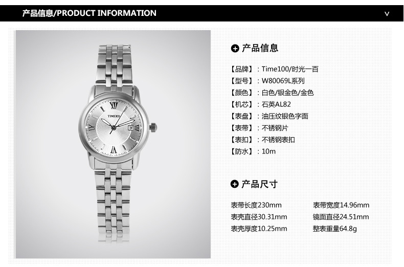 时光一百(TIME100)女表小表盘简约防水女士腕表套装女手链手表七夕礼物送女友W50888L钢色