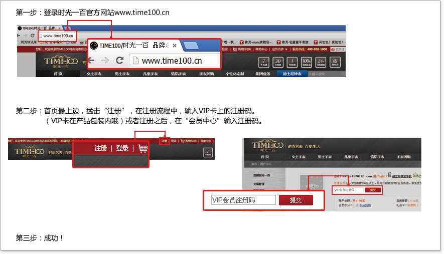 答:在time100.cn 官网或通过其它渠道购买时光一百任何一款产品,就会随即获得一张VIP卡,卡上提供的VIP激活码就是通往VIP之路的秘钥。