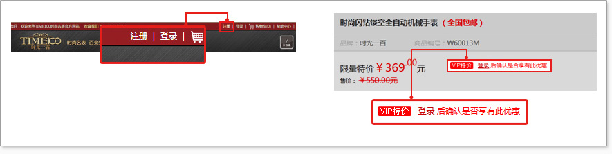答:TIME100 VIP在time100.cn官网购买商品可以独享VIP价格,VIP价格只有成为VIP成员且处于登陆状态才可以查看。TIME100 VIP优先享有各款特价商品,活动特价,新款特价。